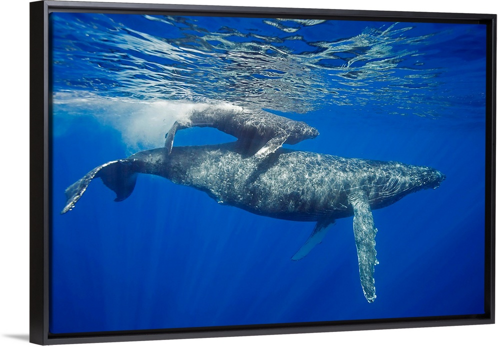 <p>A mother and calf pair of humpback whales, (Megaptera novaeangliae), come to the water's surface, Maui, Hawaii.</p>