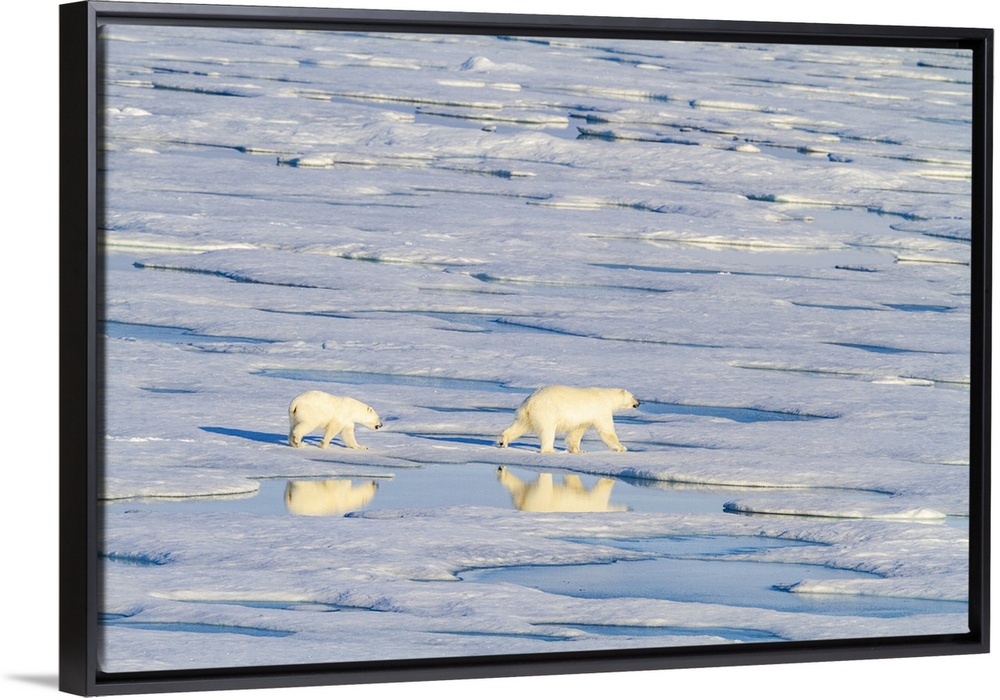 <p>A mother and cub polar bear (Ursus maritimus) traveling from ice floe to ice floe in the Svalbard Archipelago, Norway, Arctic, Europe</p>