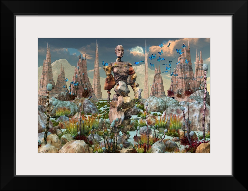 <p>A mysterious stone android stands alone in a semi-surreal alien landscape.</p>