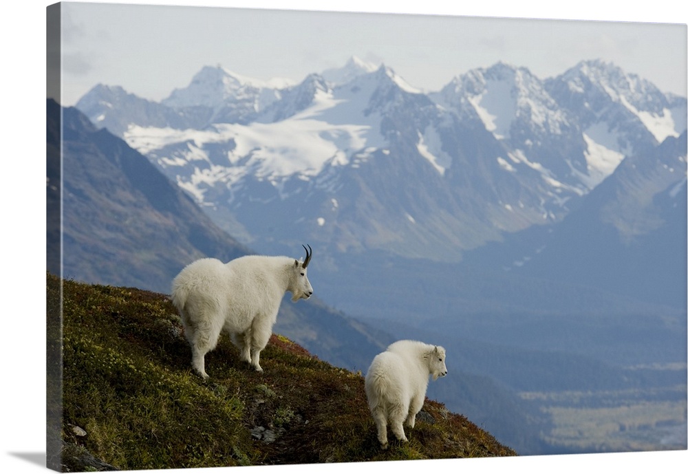 <p>A Nanny & Kid Mountain Goat Stand On A Ridge With The Scenic Kenai Mountains In The Background During Autumn, Kenai Peninsula, Southcentral Alaska</p>