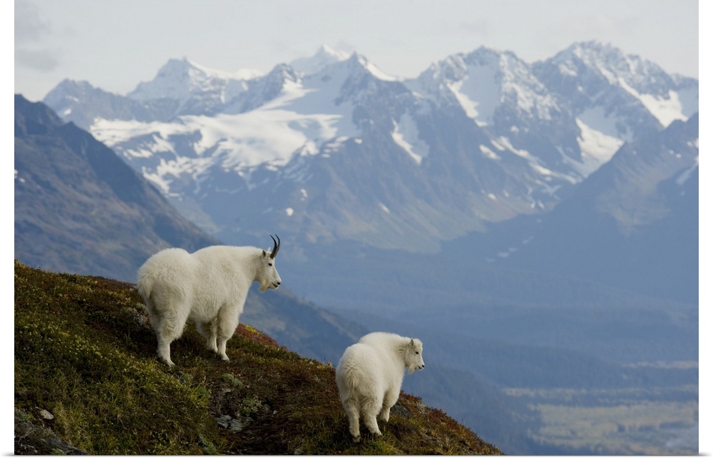 <p>A Nanny & Kid Mountain Goat Stand On A Ridge With The Scenic Kenai Mountains In The Background During Autumn, Kenai Peninsula, Southcentral Alaska</p>