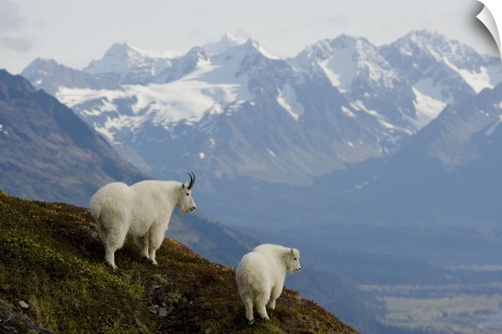 <p>A Nanny & Kid Mountain Goat Stand On A Ridge With The Scenic Kenai Mountains In The Background During Autumn, Kenai Peninsula, Southcentral Alaska</p>