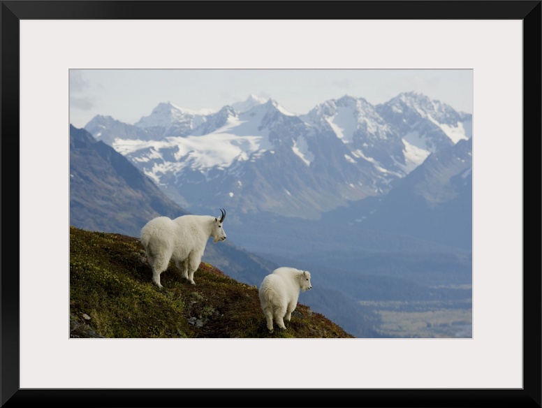 <p>A Nanny & Kid Mountain Goat Stand On A Ridge With The Scenic Kenai Mountains In The Background During Autumn, Kenai Peninsula, Southcentral Alaska</p>