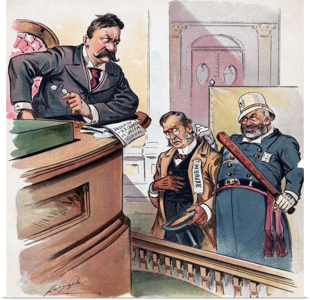<p>Political cartoon entitled A NEW CRIME, depicting a habitual reformer, being brought before a judge by a Tammany Hall policeman. Color lithograph, 1898.</p>