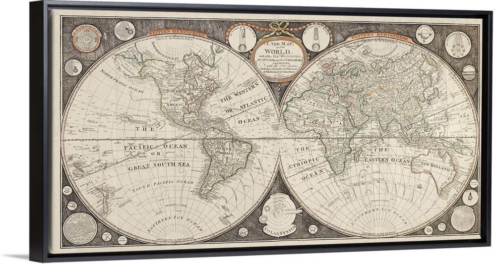 <p>This vintage wall art shows the routes of James Cook's voyages. Also shows lines of magnetic variation and marine wind-direction arrows. It includes 12 circular diagrams of sun, moon, planets, and Solar System.</p>