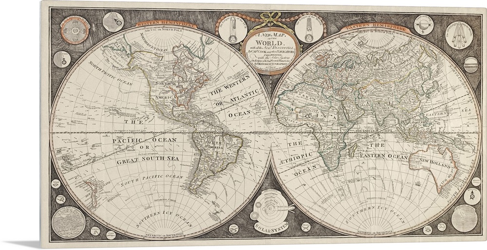 <p>This vintage wall art shows the routes of James Cook's voyages. Also shows lines of magnetic variation and marine wind-direction arrows. It includes 12 circular diagrams of sun, moon, planets, and Solar System.</p>