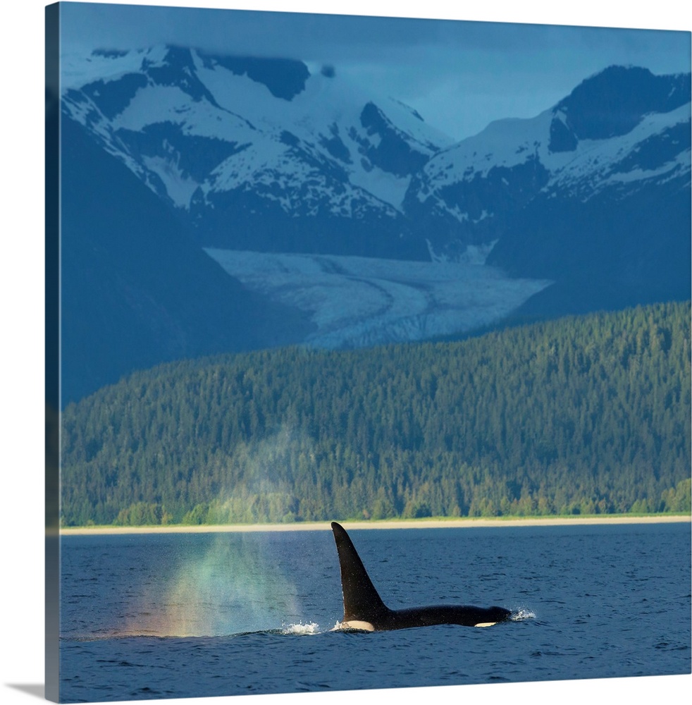 <p>The blow of a male Orca Whale catches the evening light creating a rainbow in its mist with Herbert Glacier in the background, Lynn Canal near Juneau, Alaska.</p>