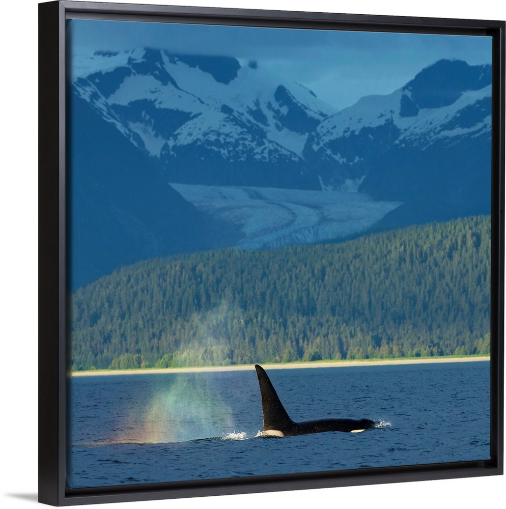 <p>The blow of a male Orca Whale catches the evening light creating a rainbow in its mist with Herbert Glacier in the background, Lynn Canal near Juneau, Alaska.</p>