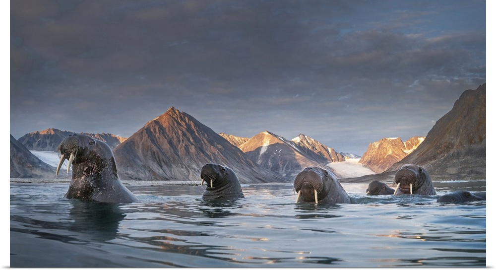 <p>A pack of Walrus (Odobenus rosmarus) depicted in Northern Spitsbergen, Svalbard Islands. Svalbard, Western Europe, Norway.</p>