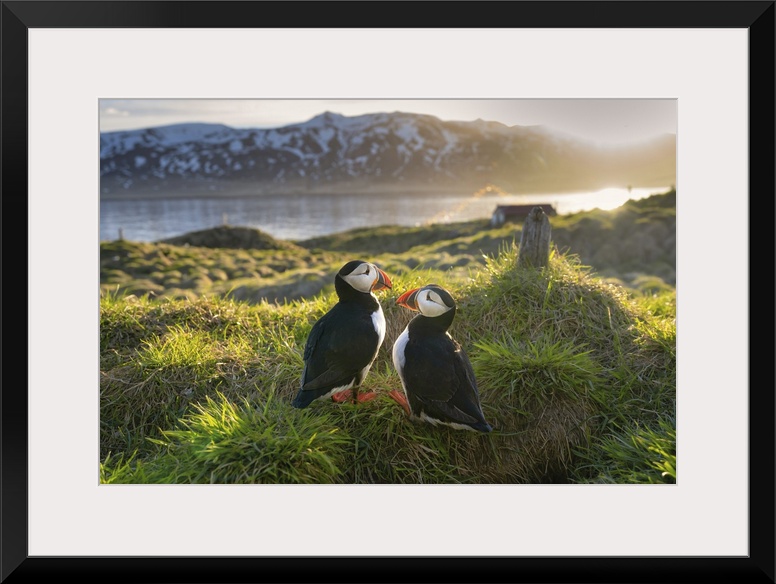 <p>A pair of Atlantic Puffins (Fratercula arctica), on a hilltop in Borgarfjaroarhofn, Iceland, Polar Regions</p>