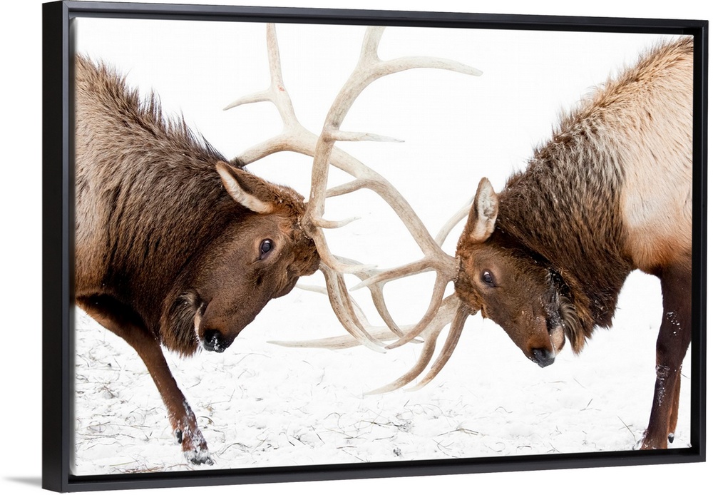 <p>A pair of large Rocky Mountain elk lock horns and fight at AWCC near Portage, Alaska. Late autumn with snow background. Captive. South-central Alaska.</p>