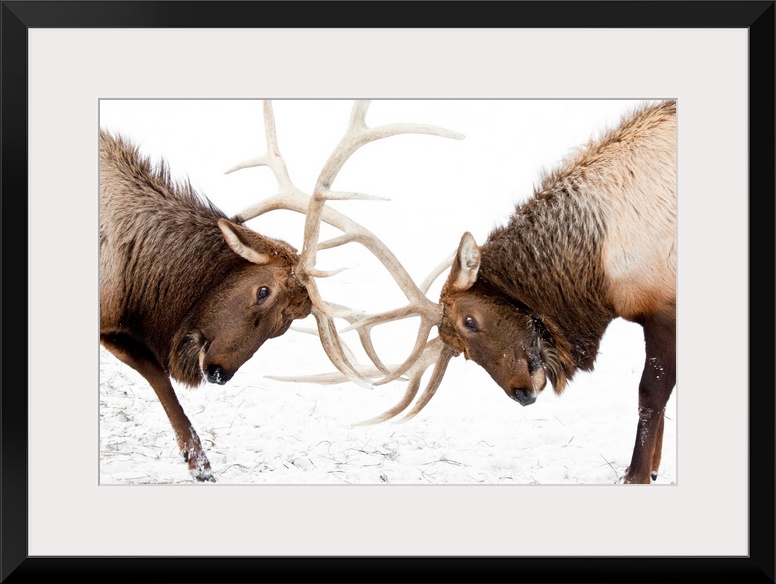 <p>A pair of large Rocky Mountain elk lock horns and fight at AWCC near Portage, Alaska. Late autumn with snow background. Captive. South-central Alaska.</p>