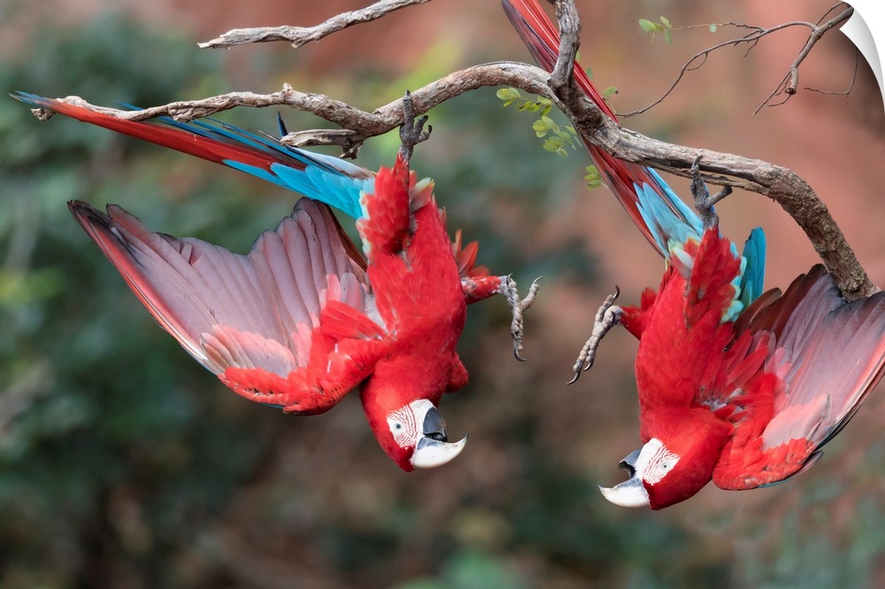 <p>South America, Brazil, Mato Grosso do Sul, Jardim, Sinkhole of the Macaws, red-and-green macaw, Ara chloropterus. A pair of red-and-green macaws playing with each other upside down. .</p>