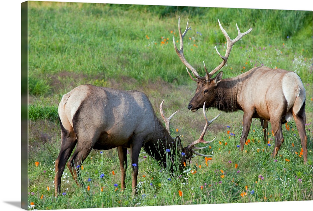 <p>A pair of captive Rocky Mountain Elk bulls feed in a field filled with colorful wild flowers at AWCC near Portage, Alaka. Bulls are antlered. Summer.</p>