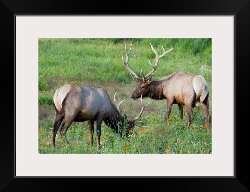 <p>A pair of captive Rocky Mountain Elk bulls feed in a field filled with colorful wild flowers at AWCC near Portage, Alaka. Bulls are antlered. Summer.</p>