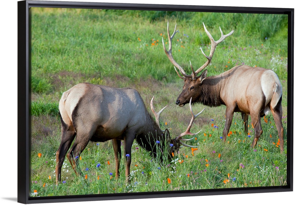 <p>A pair of captive Rocky Mountain Elk bulls feed in a field filled with colorful wild flowers at AWCC near Portage, Alaka. Bulls are antlered. Summer.</p>