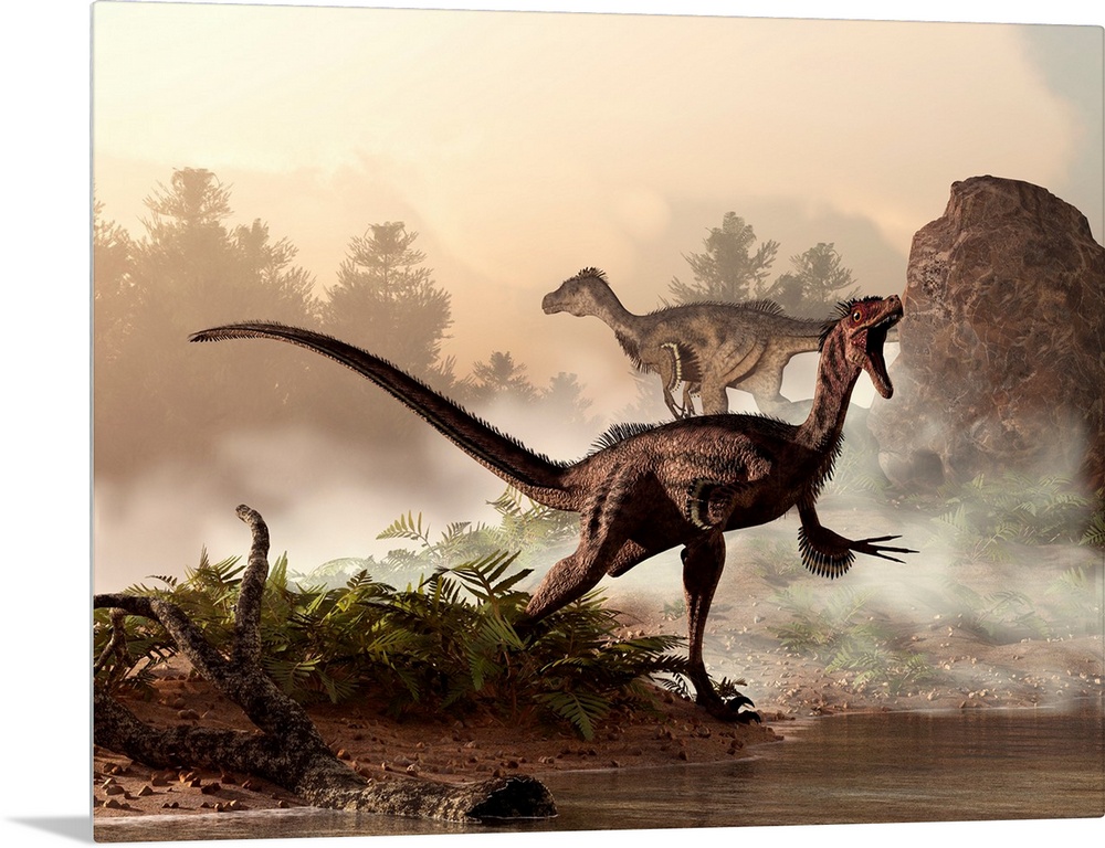 <p>A pair of velociraptors patrol the shore of an ancient lake looking for their next meal.</p>