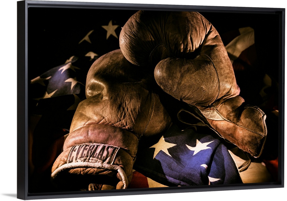 <p>A pair of vintage boxing gloves laying on a flag carefully painted with light.</p>
