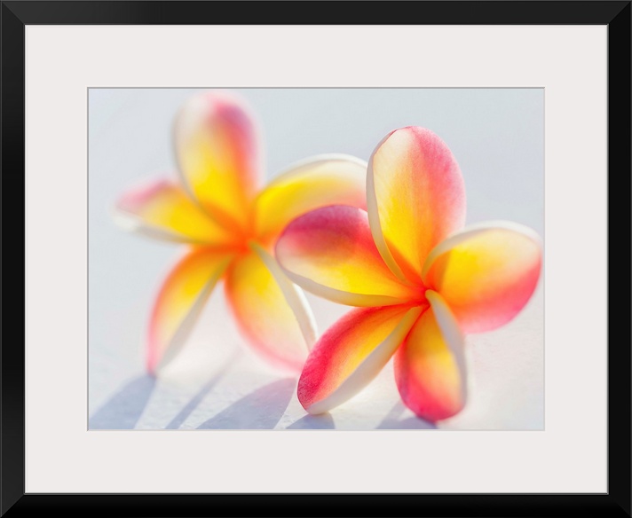 <p>A pair of beautiful yellow and pink Plumeria flowers together (Apocynaceae) on a white background; Honolulu, Oahu, Hawaii, United States of America</p>
