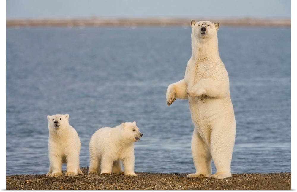 <p>A pair of young polar bear cubs look around the beach on the Beaufort Sea while their mother stands to look for danger, on the coast of ANWR, Alaska.</p>