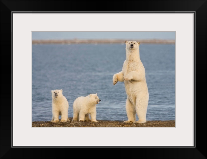 <p>A pair of young polar bear cubs look around the beach on the Beaufort Sea while their mother stands to look for danger, on the coast of ANWR, Alaska.</p>