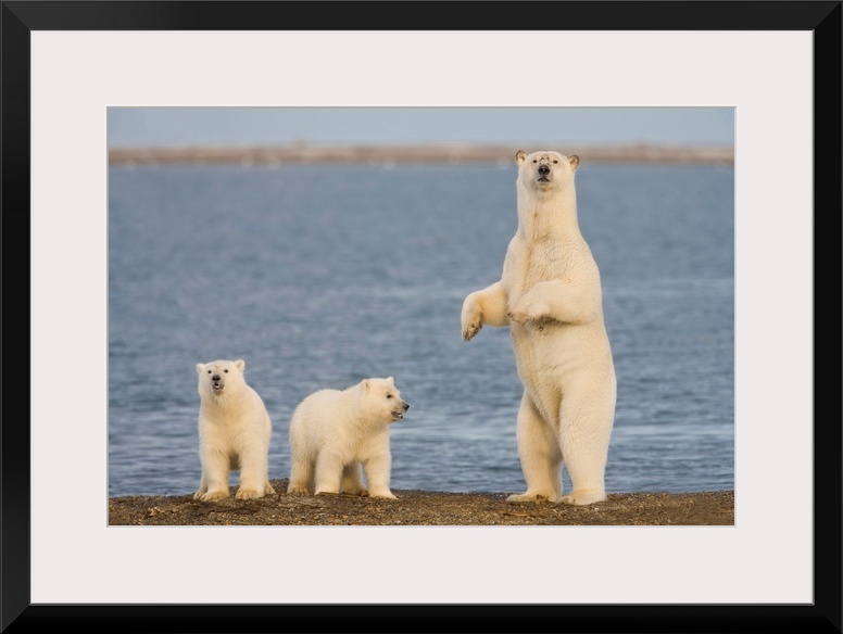 <p>A pair of young polar bear cubs look around the beach on the Beaufort Sea while their mother stands to look for danger, on the coast of ANWR, Alaska.</p>