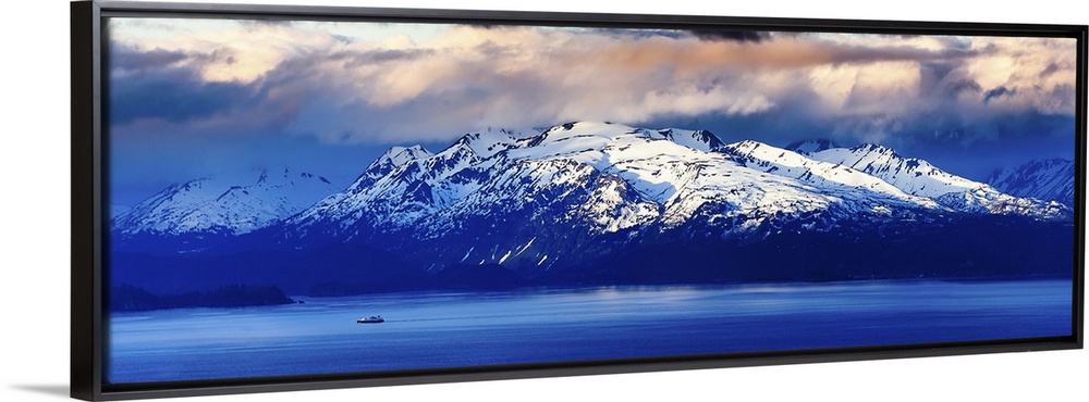 <p>A Panoramic of A Lone Fishing Boat Pulls Into Homer Bay at Sunrise; Homer, Alaska</p>