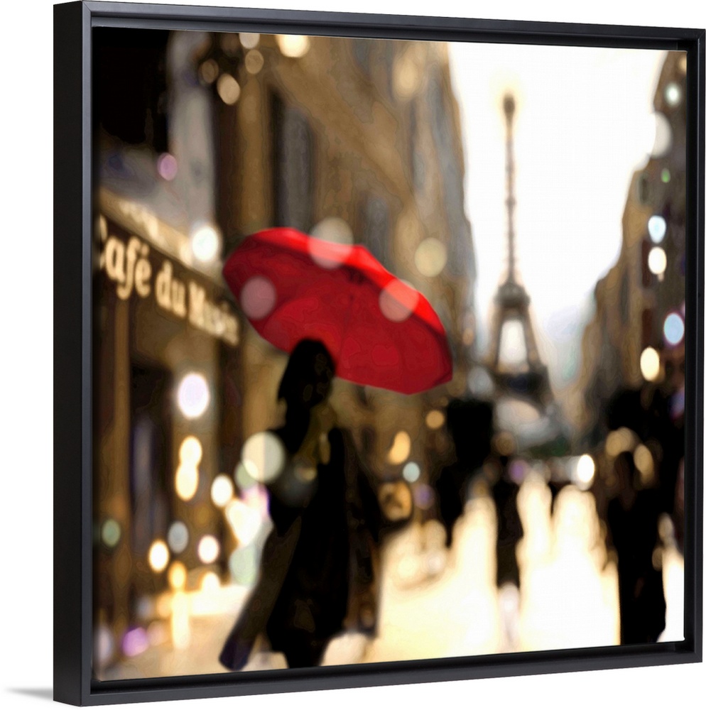 <p>Blurred square illustration of a figure walking down a Paris street carrying a red umbrella with the Eiffel Tower in the distance and bokeh lights all around.</p>
