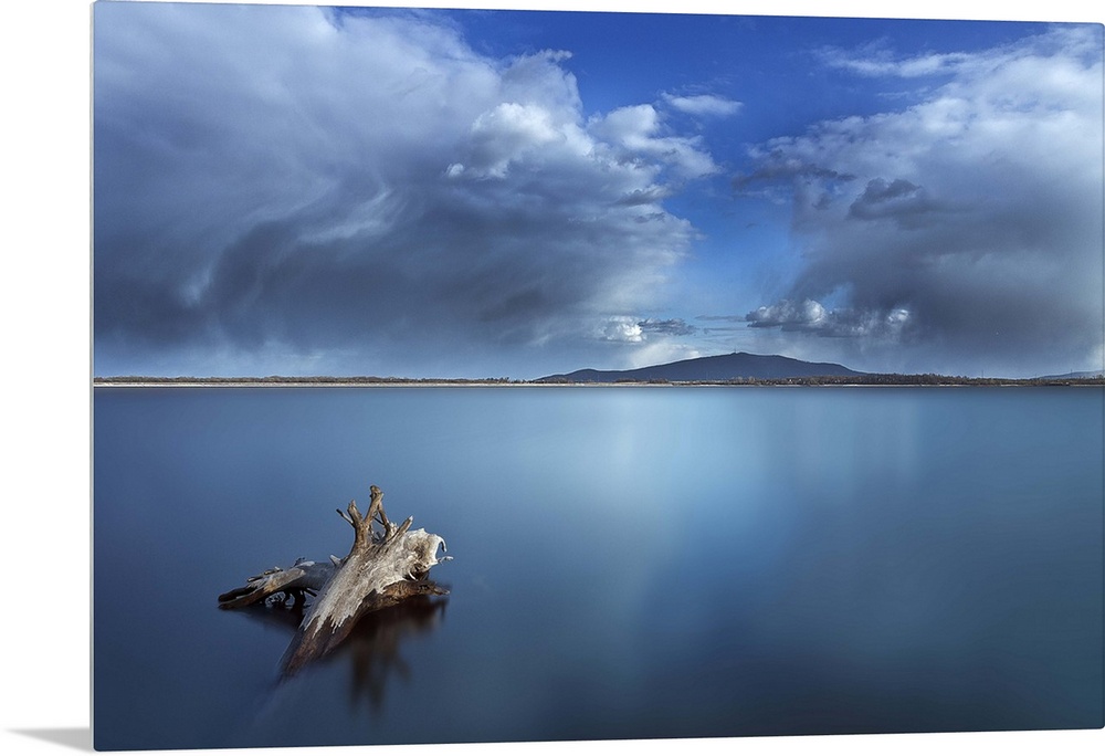 <p>A piece of driftwood in the still waters of a Polish lake, with a cloudy sky above.</p>