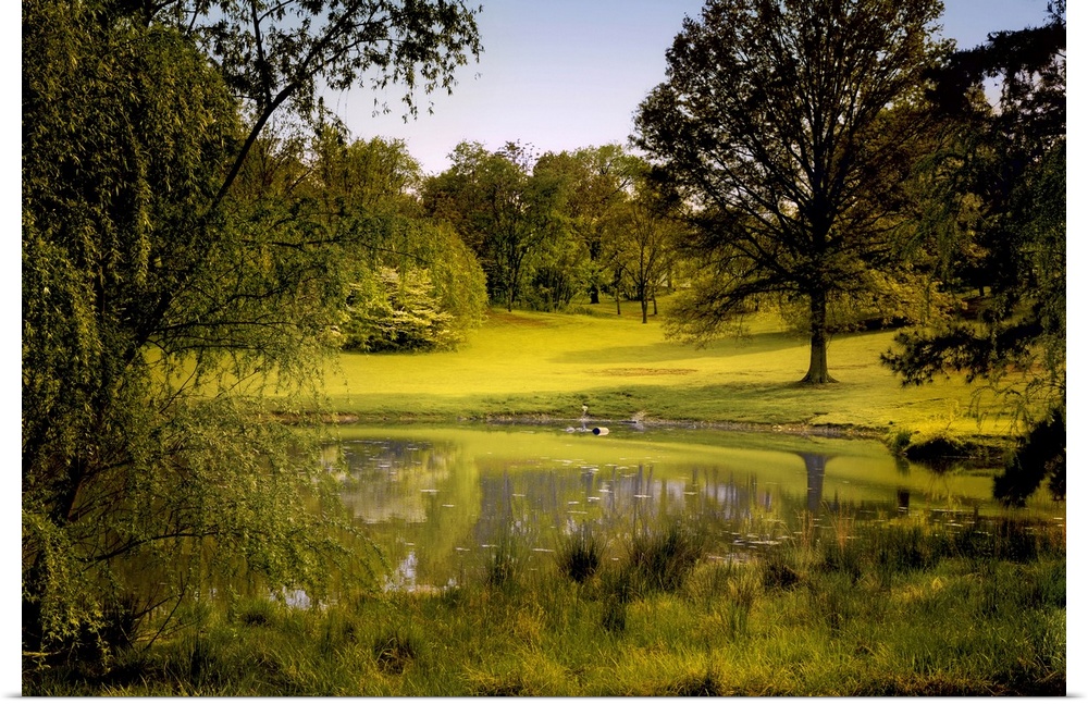 <p>A peaceful rural scene with trees lake, green grass and blue sky</p>