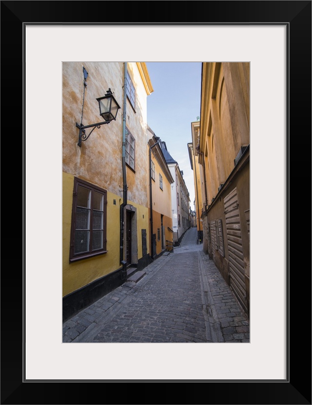 <p>A pedestrian walks the streets of Stockholm's colorful and historic Gamla Stan district, Stockholm, Sweden, Scandinavia, Europe</p>