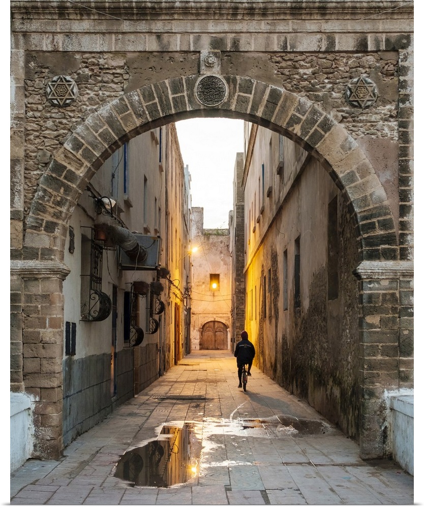 <p>Morocco, Marrakesh-Safi (Marrakesh-Tensift-El Haouz) region, Essaouira. A person rides a bicycle through a dark alley in the medina old town at dawn.</p>