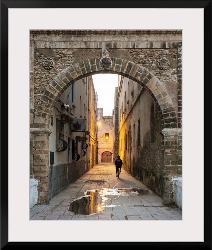 <p>Morocco, Marrakesh-Safi (Marrakesh-Tensift-El Haouz) region, Essaouira. A person rides a bicycle through a dark alley in the medina old town at dawn.</p>