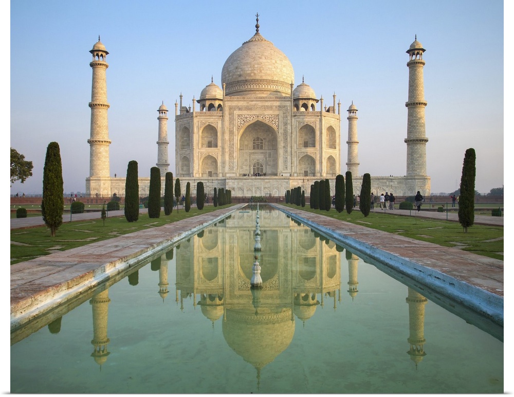<p>A perspective view on Taj Mahal mausoleum with reflection in water. Agra, India.</p>