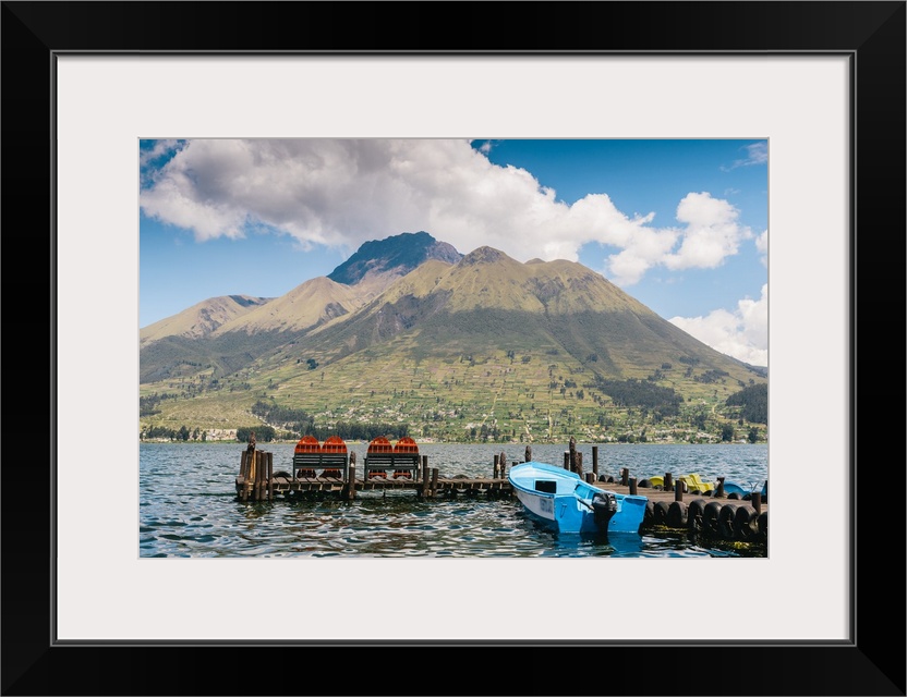 <p>A pier and boat at the base of Volcan Imbabura and Lago San Pablo, close to the famous market town of Otovalo, Ecuador</p>