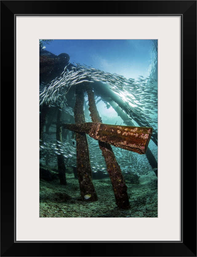 <p>A pier provides a shelter for a school of scats, Raja Ampat, Indonesia.</p>