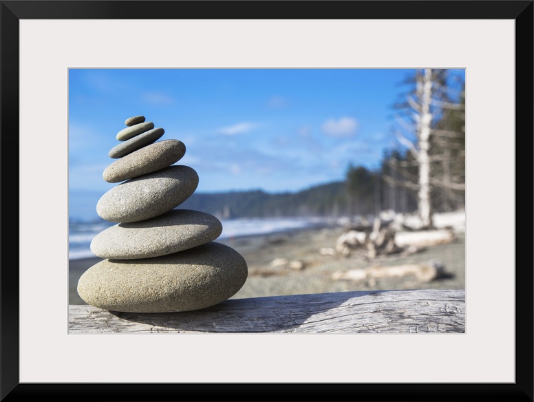 <p>A pile of balancing smooth beach rocks near Rialto Beach, Olympic national park, in Washington, USA</p>