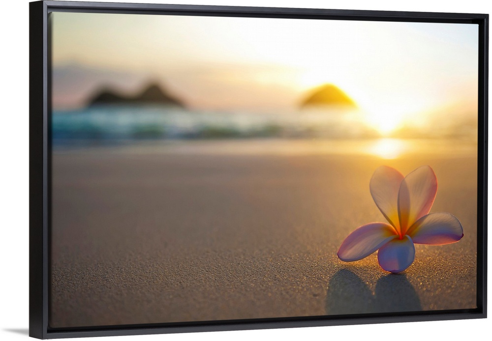 <p>A pink plumeria flower sits on the sand of Lanikai Beach in Kailua with a view of Mokulua twin islands and the ocean at sunset in the distance; Kailua, Oahu, Hawaii, United States of America</p>