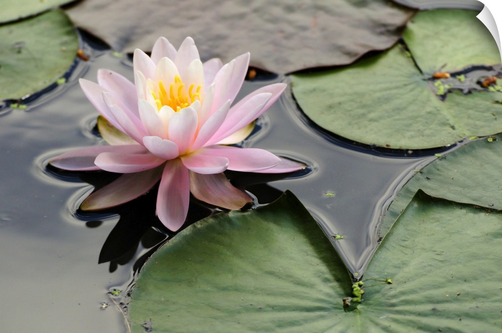 <p>A pink water lily, Nymphaea species, in a pond. Roger Williams Park, Providence, Rhode Island.</p>