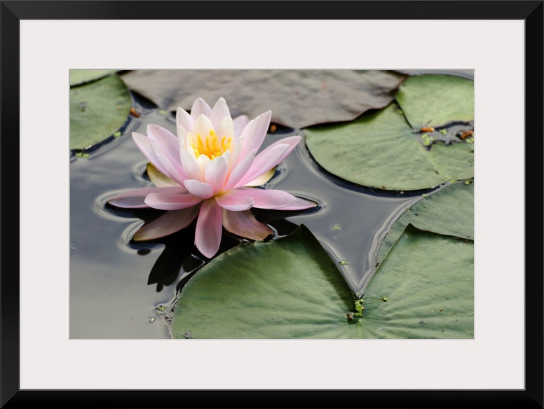 <p>A pink water lily, Nymphaea species, in a pond. Roger Williams Park, Providence, Rhode Island.</p>