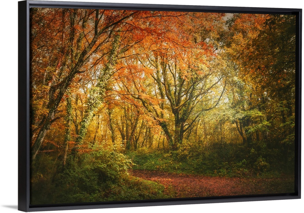 <p>Golden autumn leaves blanket the forest floor, creating a warm and inviting path through the vibrant woodland. Sunlight filters through the colorful canopy, highlighting the rich shades of red, orange, and yellow.</p>