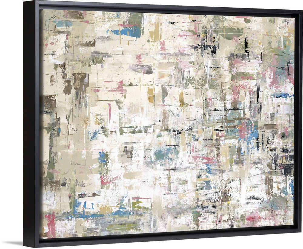 <p>Abstract painting of textured brush strokes with pastel accents, in the appearance of faint square shapes.</p>