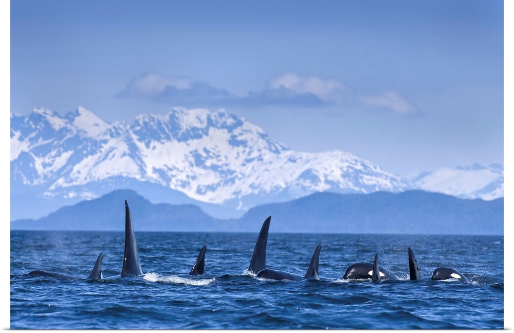 <p>Orca (Killer Whales) traveling in tight formation surface in lynn Canal, Lions Head rises beyond, Inside Passage, Juneau, Alaska</p>
