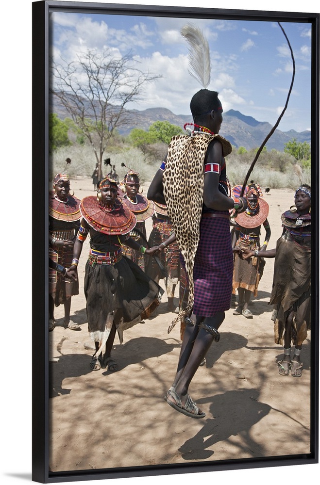 <p>A Pokot warrior wearing a leopard skin jumps high in the air surrounded by women to celebrate an Atelo ceremony. The Pokot are pastoralists speaking a Southern Nilotic language.</p>