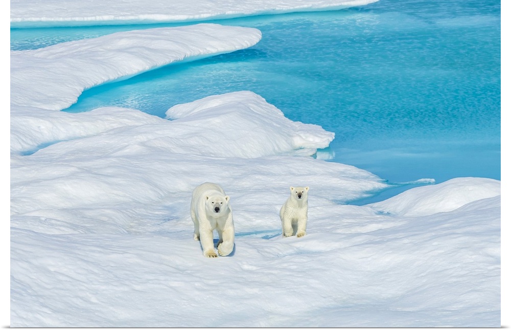 <p>A polar bear (Ursus maritimus) and its cub wander the ice floes in the Canadian Arctic.</p>