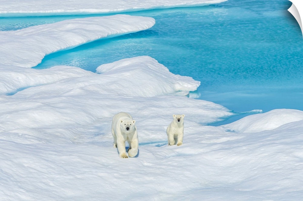 <p>A polar bear (Ursus maritimus) and its cub wander the ice floes in the Canadian Arctic.</p>