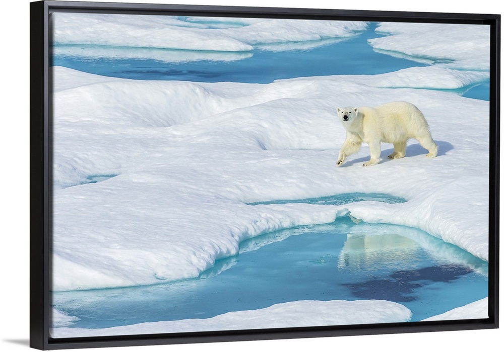 <p>A polar bear (Ursus maritimus) wanders past pools of water on an ice floe in the Canadian Arctic.</p>
