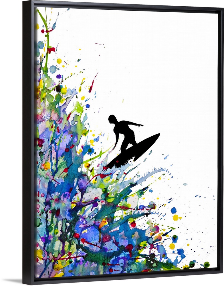 <p>Watercolor and ink painting of a silhouetted man on a surfboard on a wave of paint splatters.</p>