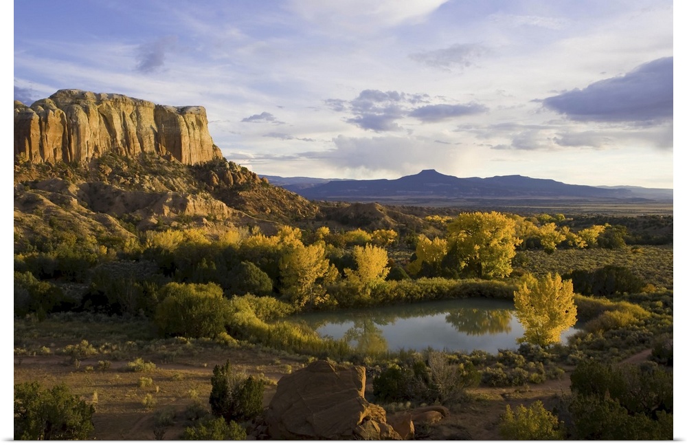 <p>A pond is seen next to Kitchen Mesa with Pedernal Peak in the distance.</p>