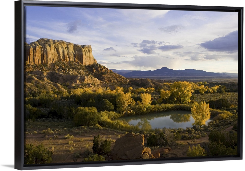 <p>A pond is seen next to Kitchen Mesa with Pedernal Peak in the distance.</p>